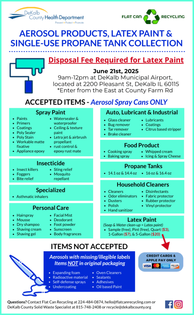 DEKALB – The DeKalb County Health Department will hold a free electronics collection and a separate aerosol, latex paint, and propane tank drop-off on June 21 from 9 a.m. to noon at the DeKalb Taylor Municipal Airport, 2200 Pleasant St. in DeKalb. Open to county residents with proof of address, the electronics event accepts items such as computers, TVs, phones, and small appliances, but excludes large appliances, alkaline batteries, and hazardous materials. The second event, hosted by Flat Can Recycling, allows disposal of labeled aerosol cans, personal care sprays, and small propane tanks, with a fee for latex paint based on container size. Credit cards and Apple Pay are accepted. For more details, contact the county’s Solid Waste Specialist or visit the Health Department’s website.