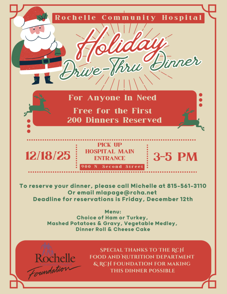 ROCHELLE – Rochelle Community Hospital and the RCH Foundation will provide a complimentary holiday drive-thru dinner for the first 200 community members in need on Thursday, December 18, from 3 to 5 p.m. at the hospital’s main entrance, 900 N. Second Street. Meals will include a choice of ham or turkey, mashed potatoes and gravy, a vegetable medley, a dinner roll, and cheesecake. Reservations must be made by Friday by calling 815-561-3110.